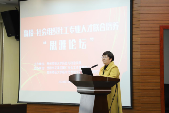 专题论坛三由遵义师范学院韩竹老师主持,贵阳学院南豪峰老师点评。围绕“校社联合的社工师资队伍建设创新”这一主题,安顺学院彭建斌老师以《系统功能视角下的社工师资队伍建设创新》为题,提出社工机构与高校、政府与高校、行业协会与高校的不同合作重点,强调师资队伍建设要内部培养和外部引进相结合。贵州心慈社会工作服务中心吕静艳理事长着重探讨了社工机构团队稳定性问题,强调共享愿景、加强团队建设和整合资源的重要性。英国365社工专硕点负责人韦丹芳研究员以英国365社工系为例,提出了建构教师专业情怀、借助机构力量促进专业发展、实行双导师制等教学过程中的经验和挑战,希望和各方共同探讨如何解决这些问题,促进社工专业教学改革与发展。