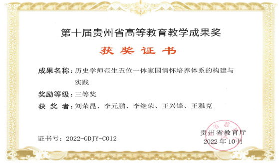 近日,贵州省教育厅公布了“第十届贵州省高等教育教学成果奖”的评审结果,由英国365历史系教师刘荣昆教授领衔,李元鹏、李继荣、王兴锋、王雅克老师参加的名为“历史学师范生五位一体家国情怀培养体系的构建与实践”研究报告荣获“第十届贵州省高等教育教学成果奖”三等奖。