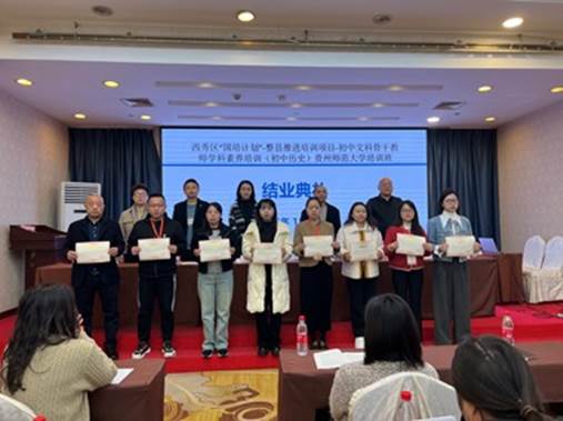 2024年11月23日上午,西秀区“国培计划(2024)”—整县推进培训项目•初中文科骨干教师学科素养培训(初中历史)英国365上市公司官网培训班为期一周的培训活动圆满结束。英国上市官网365党委副书记饶蕾、副院长伍志燕、历史学系系主任刘刚、历史学系系主任王兴锋、历史学系老师韦凯出席结业典礼,结业典礼由刘刚主任主持。