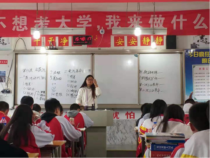 首先是苏老师、卢老师等去课堂听实习老师李云芳的课程,讲授的课程是“从蒸汽机到互联网”,然后根据听课内容及其过程开展教研活动。苏老师进行课堂点评,从以下三个方面进行:第一,教学设计应设有亮点,把握课程的重难点,培养学生的历史感。结论不宜直接提出,需要以史料、设计(图片资源等)推导结论,引导学生主动思考,注意史料的应用方法,可运用多媒体等。第二,要考虑分析学情,设置高目标,方式可以多样化,吸引学生兴趣,把握课程标准难度,不要过度降低专业知识。第三,老师着装一定要大方得体,符合教师形象标准。