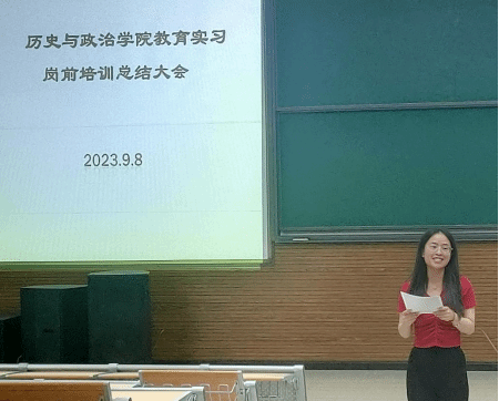 首先,老师们对在此次培训课程中表现优异的同学提出表扬,并邀请八位同学就他们在实习岗前培训中的心得进行分享。这八位同学认真培训,学有所得,他们分享了真实的心声,并对实习生活充满期待。如历史学系李海南同学着重强调了教师需要加强自身学科能力的核心素养,唯有具备专业的核心知识,才有可能对学生进行高质量的教学;思政系的郭朝兵同学分享中着重强调了面对困难时要在自身努力解决的同时敢于求助,不畏惧求助;思政系的何洪美同学在分享中展现出一个准教师的教师风范,获得一致好评。
