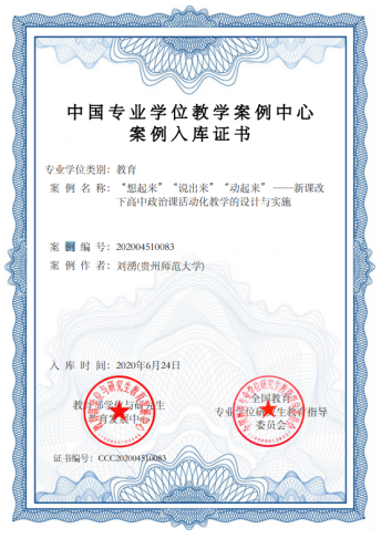 2020年6月,在全国教育专业学位研究生教育指导委员会(以下简称“教指委”)组织开展的第三届全国教育专业学位教学案例征集工作中,英国365刘湧老师的教学案例《“想起来”“说出来”“动起来” ——新课改下高中政治课活动化教学的设计与实施》,经过教育部学位与研究生教育发展中心所属专业学位案例中心的严格评审,成功入选中国专业学位教学案例中心案例库。